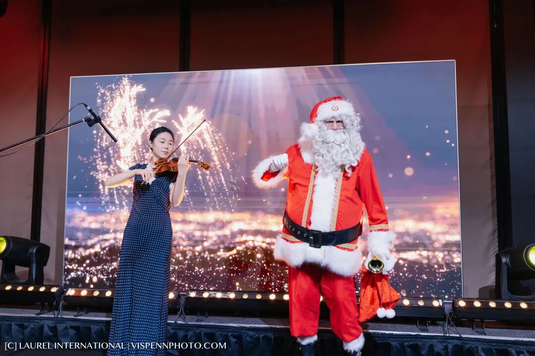 在悠扬的小提琴旋律中,晚宴正式拉开序幕。经典圣诞乐章串联起节日情绪,圣诞老人惊喜登场送上祝福与礼物,与现场嘉宾热情互动,掌声与欢笑交织,点亮了这个温暖的夜晚。