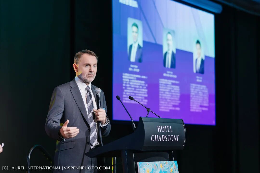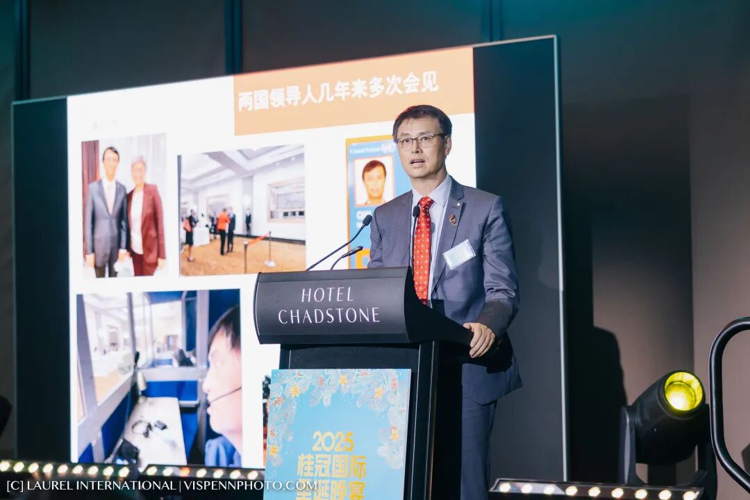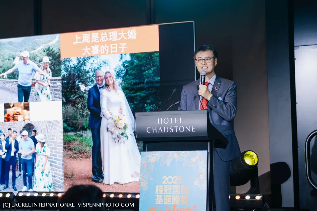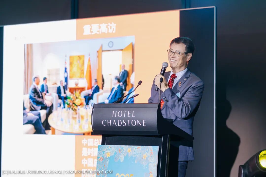 1818俱乐部执行主席、秦皇翻译创始人、澳大利亚勋章获得者秦潞山教授登台致辞。他以真挚而深刻的分享,回顾中澳交流与个人经历,赢得全场热烈掌声,也为晚宴注入了思想与温度并存的力量。