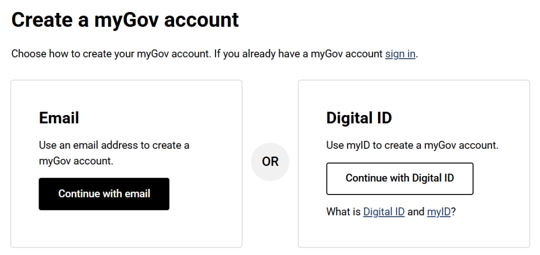 2. 通过myGov账户申请如果您还没有注册 myGov 账户,您需要用邮箱或 myID 先注册账号