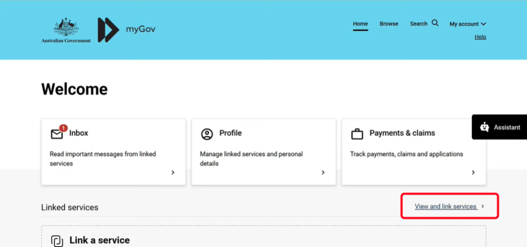 首先登录您的 myGov 账号,点击 ”View and link services“ 找到 Medicare service。