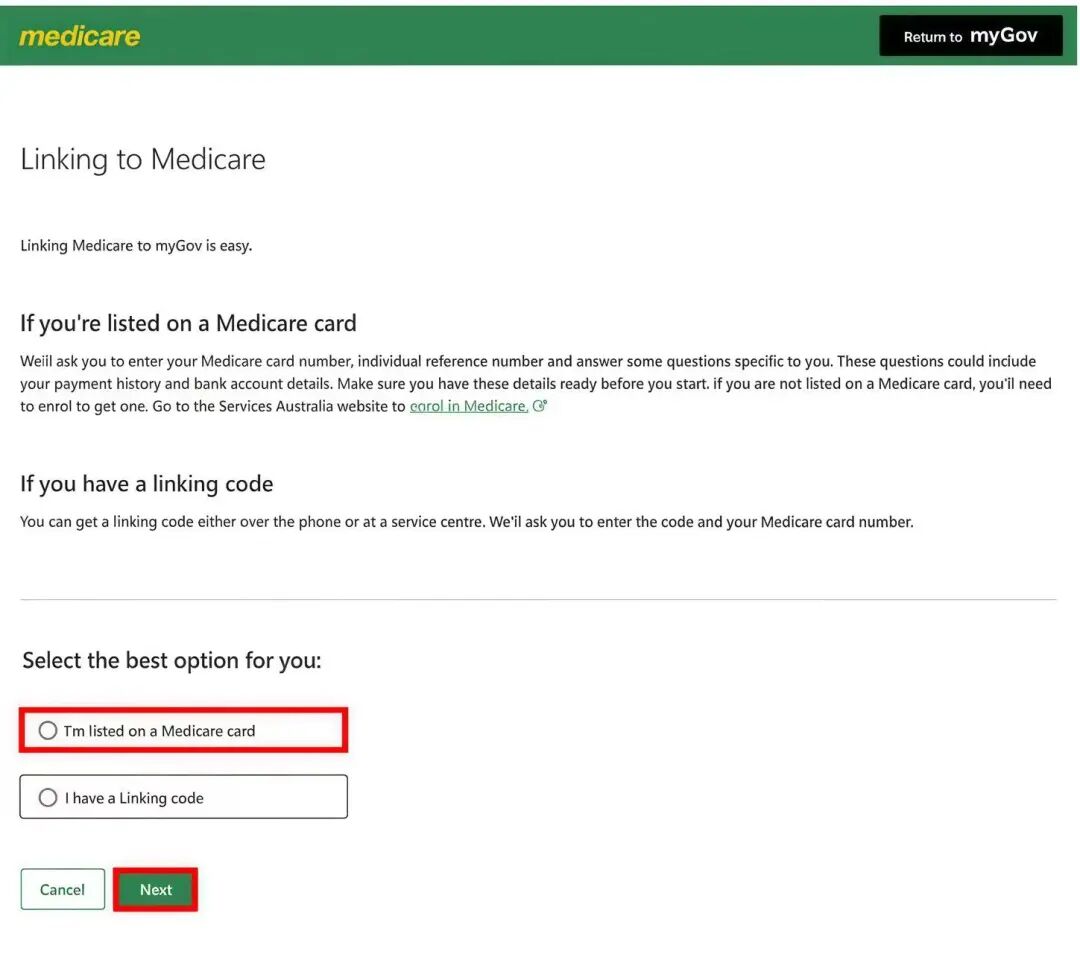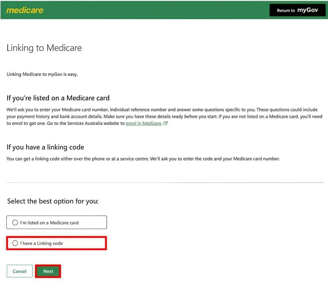 填写 Linking code 和您的 Medicare 卡面信息(卡号,您名字前的数字)点击下一步 ”Next“,便可完成关联。