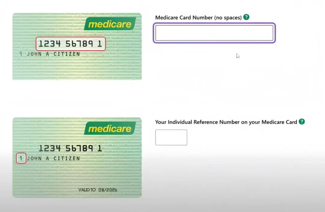 填写 Medicare 卡信息(卡号和名字前的数字)以及个人信息(姓名,生日,住址)