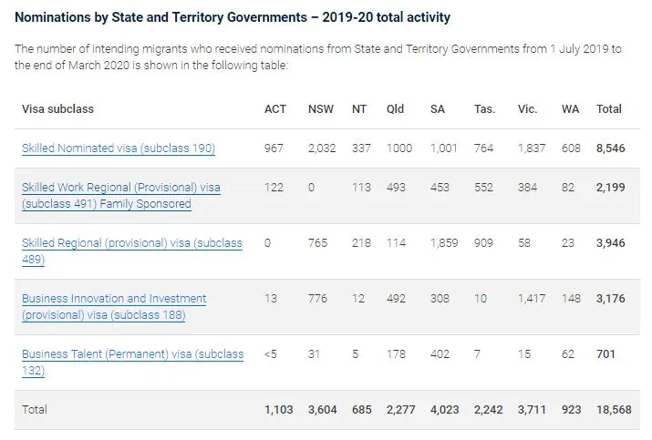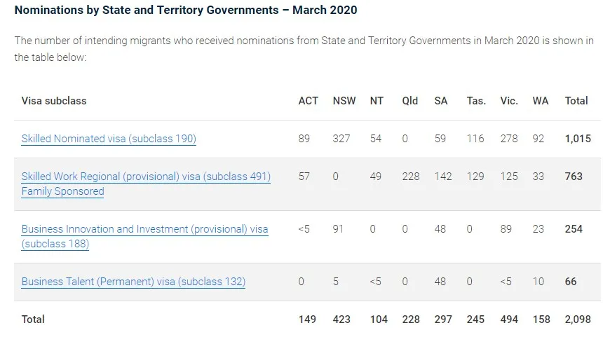 2020年3月18日,新州与昆士兰州宣布2019-20财年移民配额已满,州担保提名申请关闭。新南威尔士州宣布商业移民前端签证移民配额告罄,关闭188签证类别及132签证类别州担保提名申请,包含188A/188B/188C/188E以及132SBH签证。昆士兰州关闭190签证以及商业签证(188签证及132签证)州担保申请,开放申请通道的时间将在2020年7月新财年开始后。