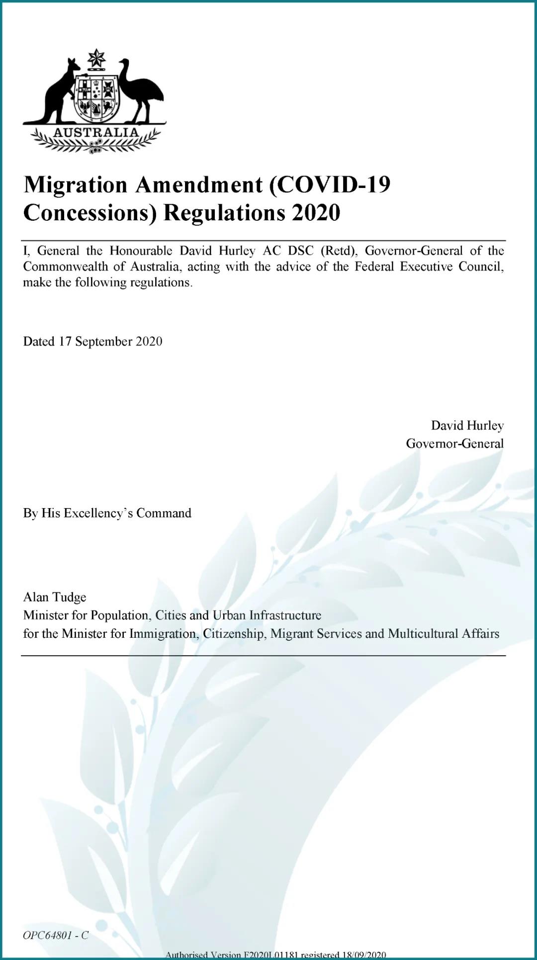 澳大利亚联邦总督David Hurley阁下特准通过了由联邦移民部长Alan Tudge阁下递交《2020年移民修正(新冠肺炎特许)条例》的申请,该条例于2020年9月19日起生效。正如联邦移民部长Alan Tudge阁下在一份陈述中说“新冠疫情特许期”的引入是希望减少对受到疫情影响而身处澳洲境外的临时签证持有人。